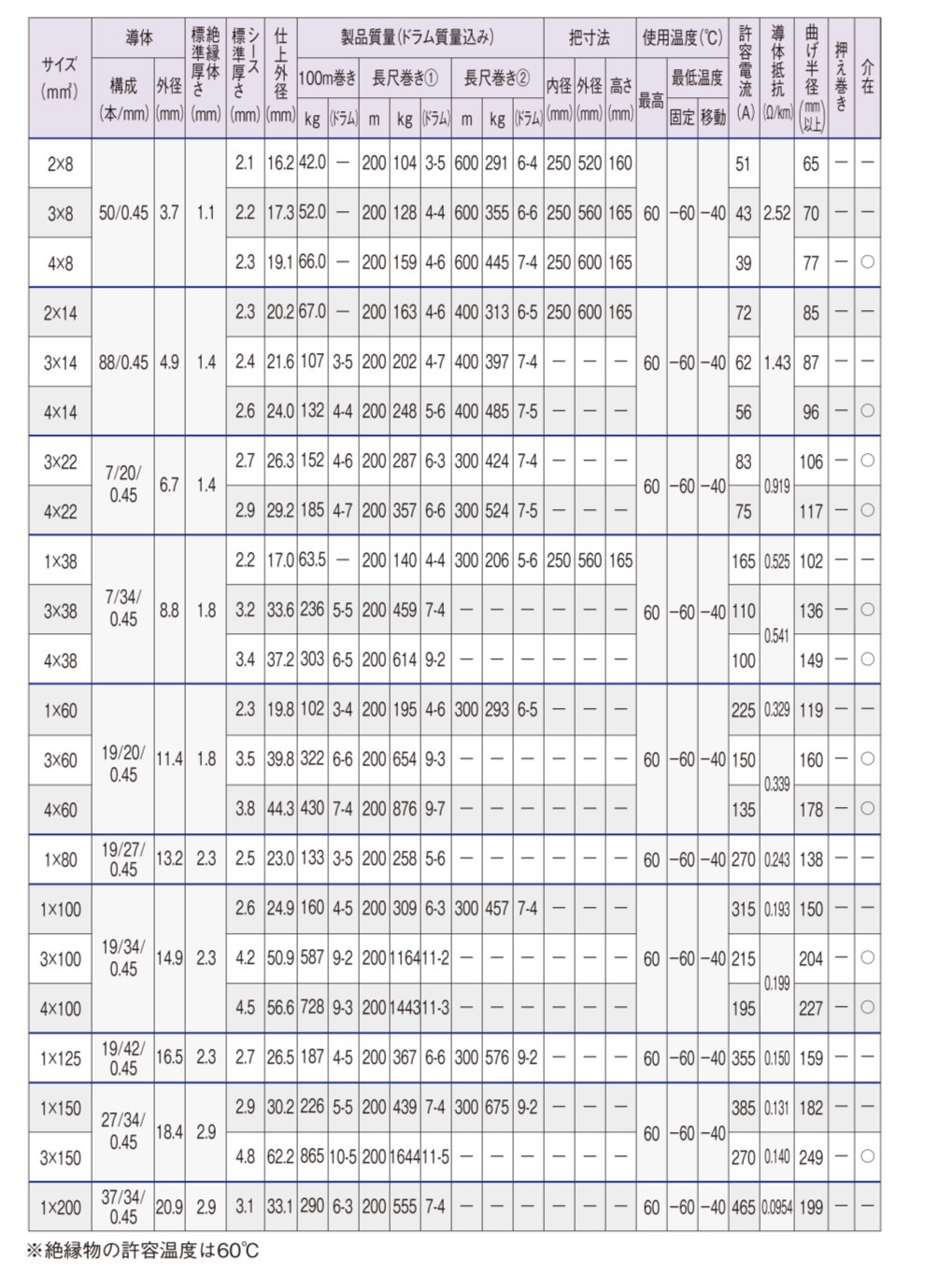 絶縁体、シースともに天然ゴムを使用しているので、柔軟性・耐寒性に優れています。